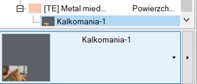 Kiedy do tekstury przypiszesz kalkomanię, ten zasób zostanie umieszczony (z pewnym wcięciem tekstu) pod głównym elementem listy w Próbniku tekstur. Po zaznaczeniu kalkomanii zostanie wyświetlona jej miniaturka.