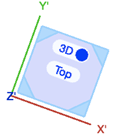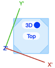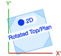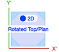 W obróconym rzucie 2D/głównym sześcian kostki oraz osie X' i Y' pozostaną w nieobróconej pozycji, zaś dolna ściana kostki wyświetla się w kolorze płaszczyzny roboczej. Etykieta kostki ma tytuł „Obrócony rzut 2D/główny”.