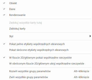 Widok współrzędnych w palecie Info w obróconym rzucie 2D/głównym można skorygować w Menu palety Info, dostępnym na pasku tytułu palety Info w zakładkce Obiekt. Wskaż, czy chcesz wyświetlać współrzędne ekranowe z pełnymi lub skróconymi etykietami oraz czy, należy pokazać współrzędne rzeczywiste w obróconym rzucie 2D/głównym.