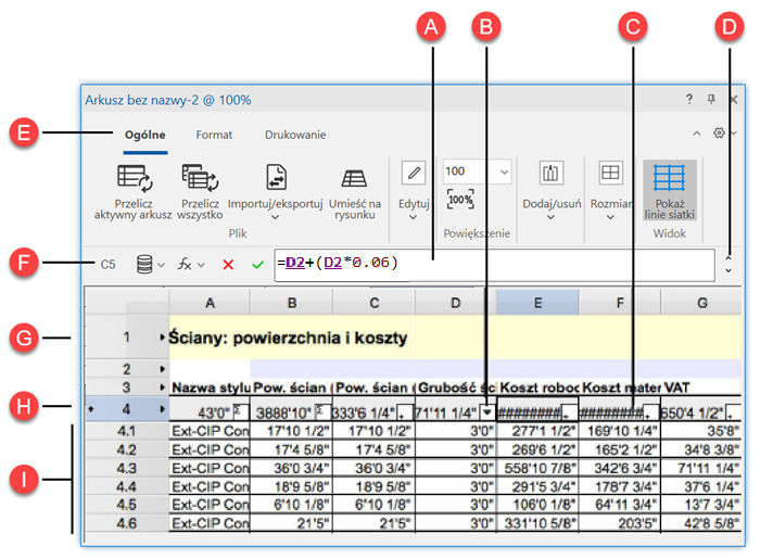 A: Pasek formuły B: Otwórz okno, aby edytować w nim zawartość kolumny C: Poszerz kolumnę, aby wyświetlić liczbę D: Zwiń/rozwiń pasek formuły E: Pasek narzędzi z zakładkami F: Pasek formuły G: Wiersz arkusza H: Wiersz nagłówka I: Podwiersze (wiersze rozwijane) |